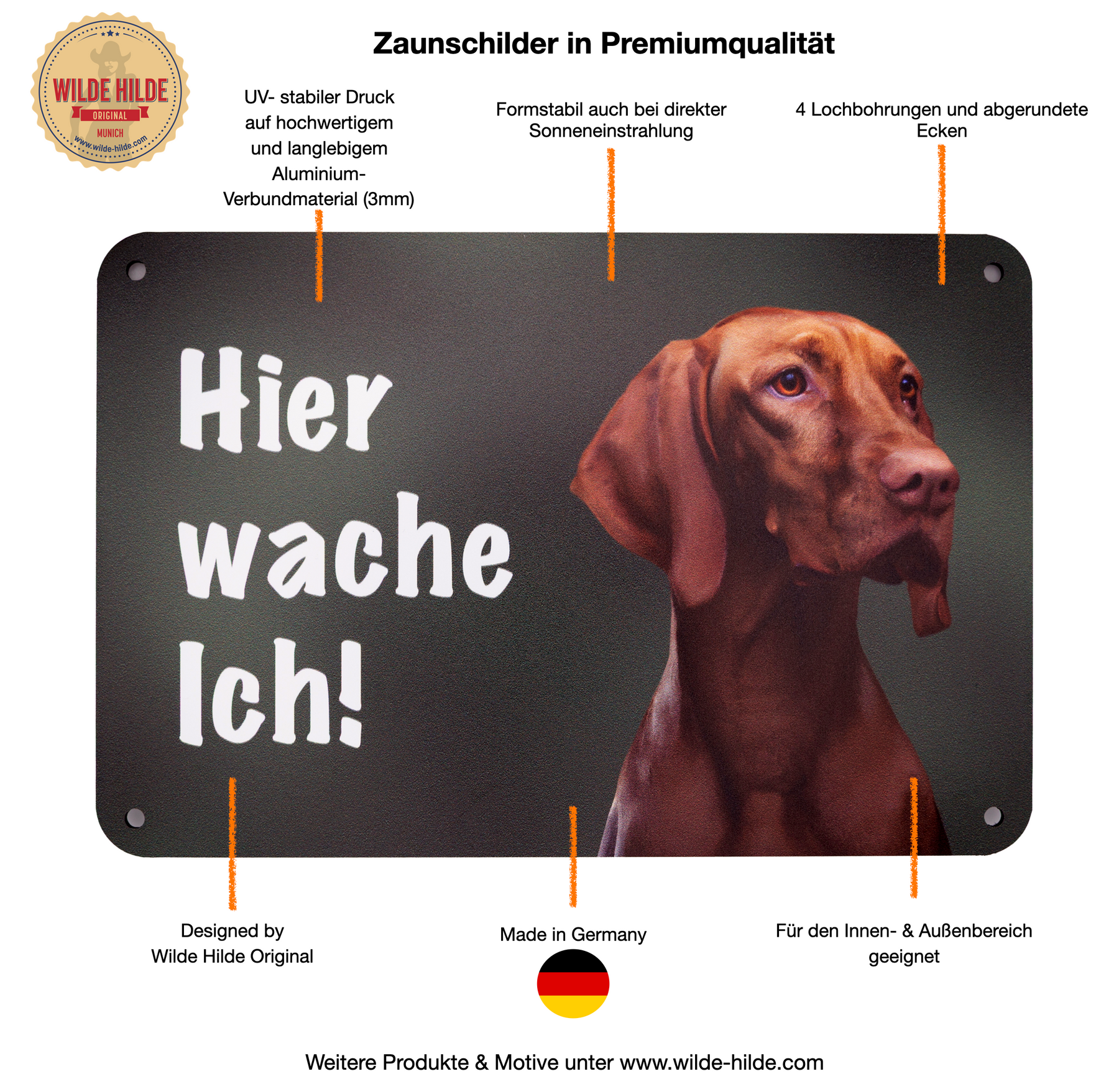 Die exklusiven Metall Hundeschilder von Wilde Hilde Original sind mehr als nur Dekoration – sie sind ein Statement für alle Hundefreunde, Jagdhundeführer und Tierliebhaber. Dieses hochwertige Hier wache ich! Schild mit Deutsch Kurzhaar -Motiv kombiniert charmantes Design mit langlebiger Qualität und ist das ideale Accessoire für deinen Gartenzaun oder Eingangsbereich.